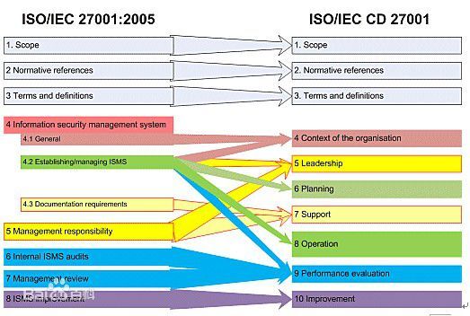 導則83對今后的標準提出了新的框架要求,如下圖示,標注了ISO27001新版與2005版結構的對比和差異: